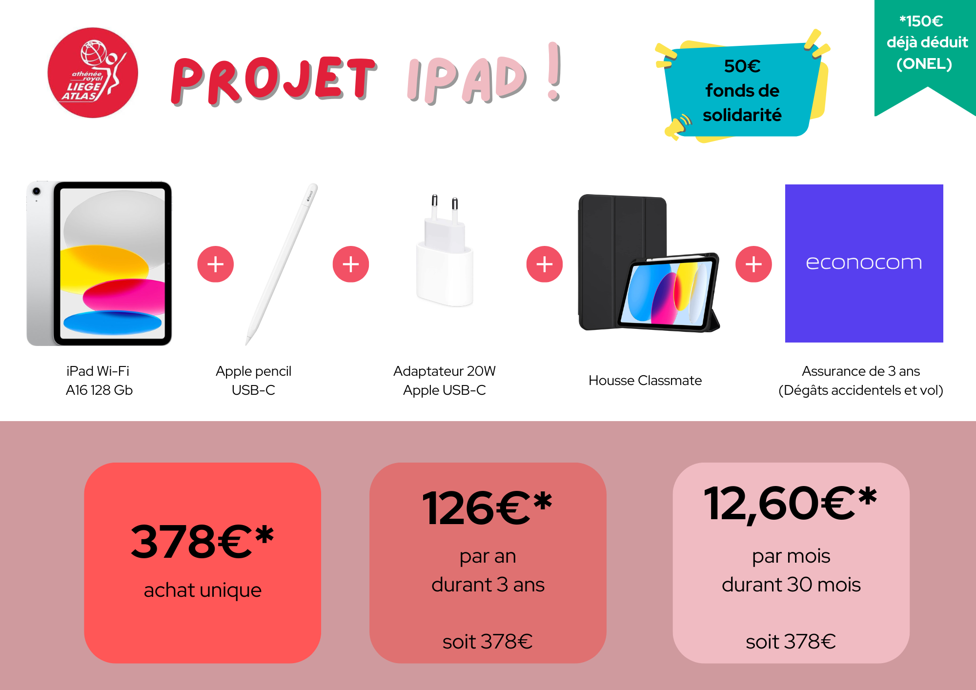 Cette tablette sera agrémentée d’une housse Classmate, d’un stylet Apple Pencil USB-C ainsi que d’une assurance de 3 ans.